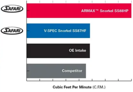 Обратите внимание - вода выводится через специальные каналы. Универсальное решение с максимальной производительностью, рекомендовано для средней полосы и лесных местностей. На картинке ниже - пример производительности для серий Airmax, V-SPECS и ОЕМ впуска, обратите внимание - комбинации из труб и прочего в графе Competitor - "душат" ваш мотор и не дают использовать всю его мощность.
