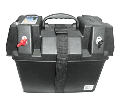 Пластиковый короб для установки и защиты от влаги аккумуляторной батареи. На корпус выведены контакты для подключения питания и указатель уровня заряда батареи, разъем под прикуриватель.