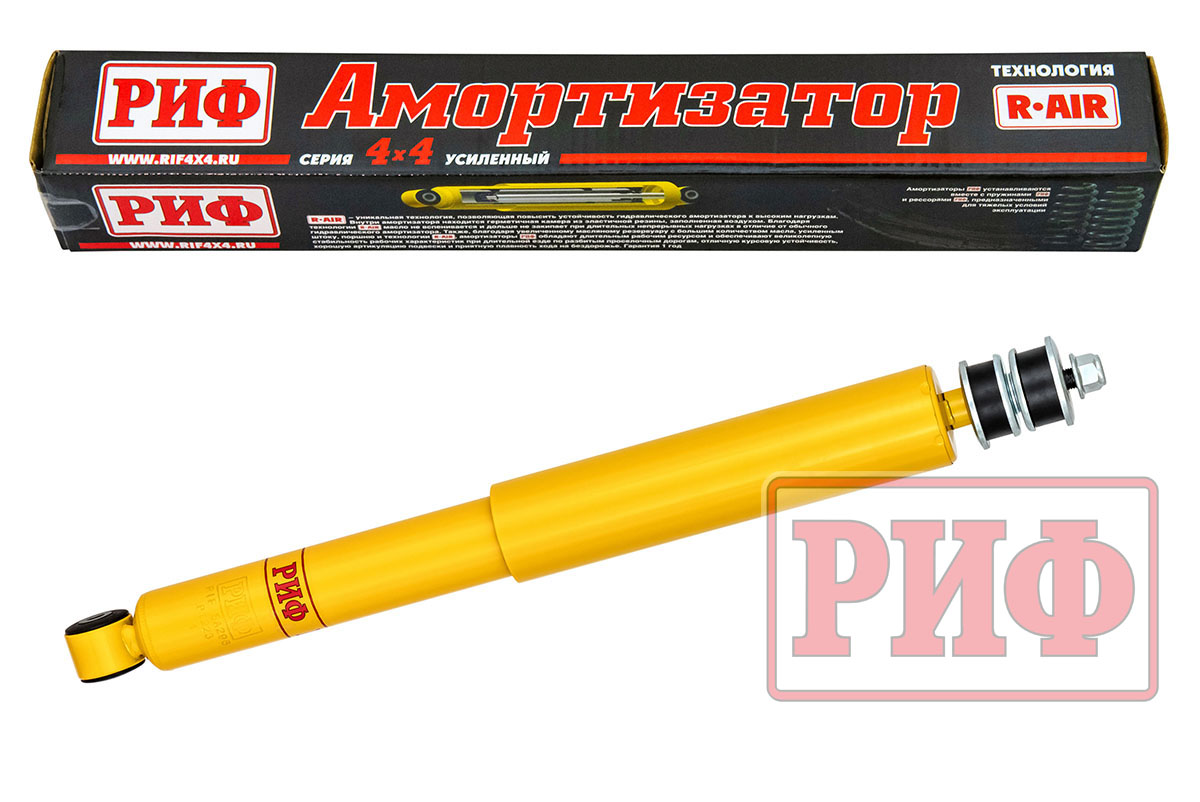 Усиленные амортизаторы РИФ изготовлены по уникальной технологии R-AIR, позволяющей повысить устойчивость гидравлического амортизатора к высоким нагрузкам. Внутри амортизатора находится герметичная камера из эластичной резины, заполненная воздухом. Благодаря технологии R-AIR масло не вспенивается и дольше не закипает при длительных непрерывных нагрузках в отличие от обычного гидравлического амортизатора или амортизатора с технологией Foam Cell, которую мы использовали ранее, где вспениванию препятствует просто прослойка из пористой резины.