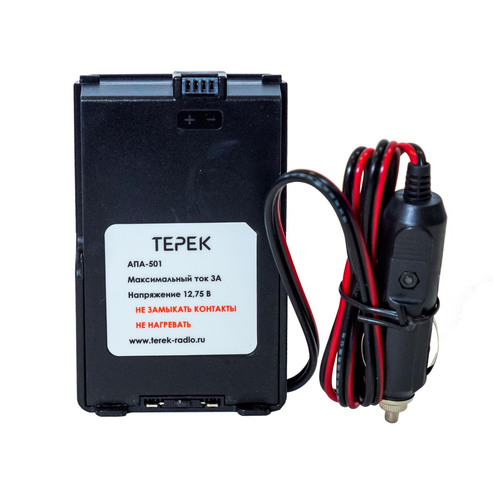 Адаптер питания от автомобильного прикуривателя для радиостанций Терек РК-501 и Терек РК-501-2Д. Используется вместо аккумулятора радиостанции.