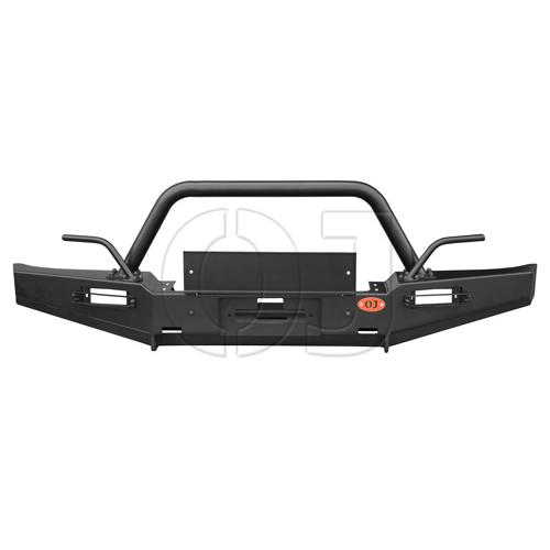 Передний силовой бампер серии Трофи на УАЗ Буханка, с встроенной горизонтальной площадкой лебёдки и съёмной защитной дугой. Передний силовой бампер серии Трофи на УАЗ Буханка с встроенной горизонтальной площадкой лебёдки, съёмной защитной дугой, буксирными проушинами, ПТФ GH-72RB с защитными решётками, рогами для смотки троса, защитной рамкой НЗ, упорами под реечный домкрат.