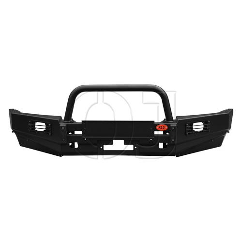 Передний силовой бампер серии Трофи на GW Wingle 7 с вертикальной площадкой лебёдки, светодиодные ПТФ с защитными решётками, съёмной трапециевидной дугой и другим дополнительным оборудованием.