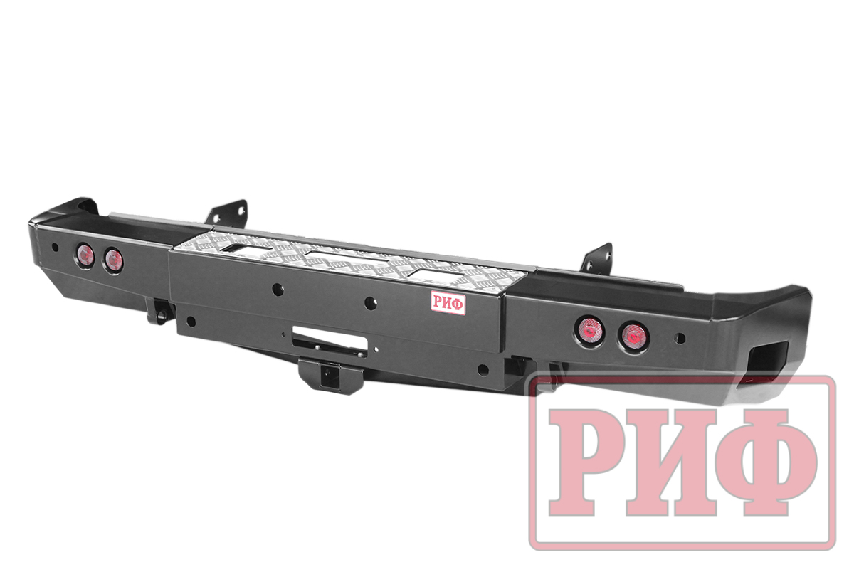 Задний силовой бампер РИФ надежно защитит кузов автомобиля на бездорожье или в городе в случае непредвиденных инцидентов. Бампер оборудован упорами под хай джек и буксирными проушинами для работы с рывковой или буксировочной стропой.