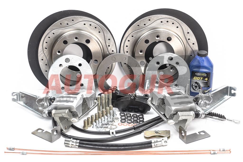 - Установка данного комплекта реализует привод ручного тормоза на заднюю ось, благодаря конструкции суппорта, имеющей механизм стояночного тормоза. За основу взяты суппорта передних дисковых тормозов ГАЗ (скоба и направляющие) 3302 и 2207.