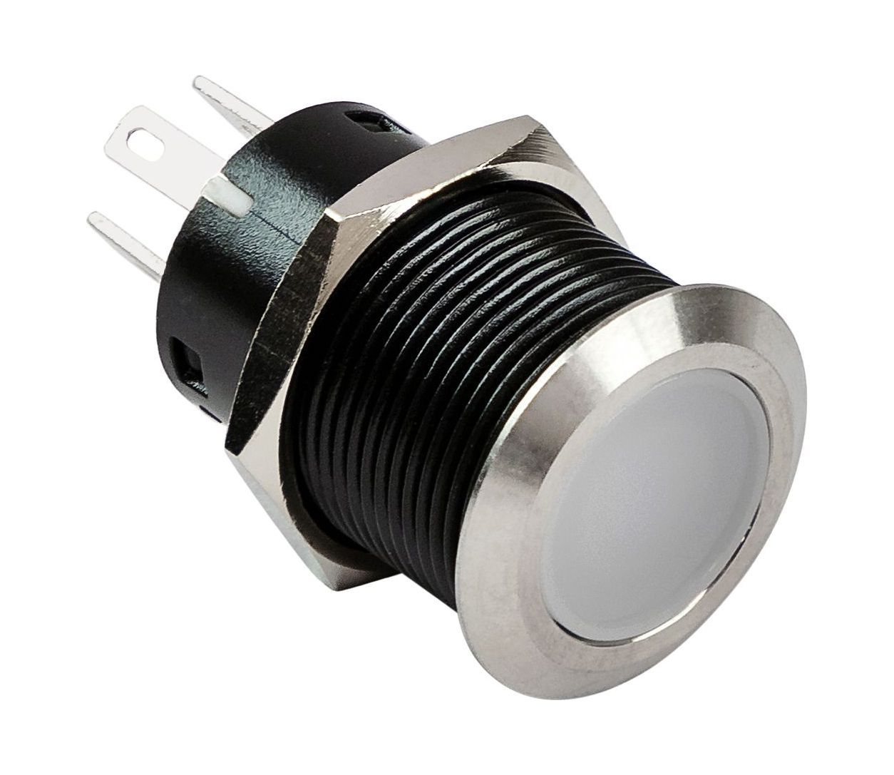 Кнопочный выключатель без фиксации из нержавеющей стали со светодиодным кольцом и с информационными наклейками.