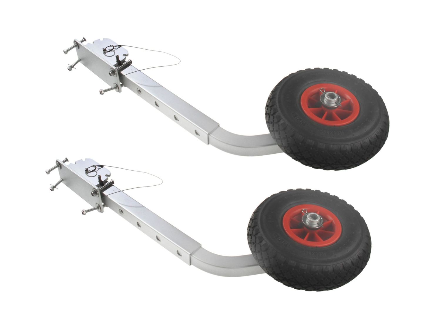 Комплект колес с пневмошинами для надувных лодок. Колеса фиксируются с помощью специального запорного механизма в транспортном или в походном положении. Отличный выбор для облегчения ручной транспортировки надувной лодки. Устанавливаются на транцевую доску.