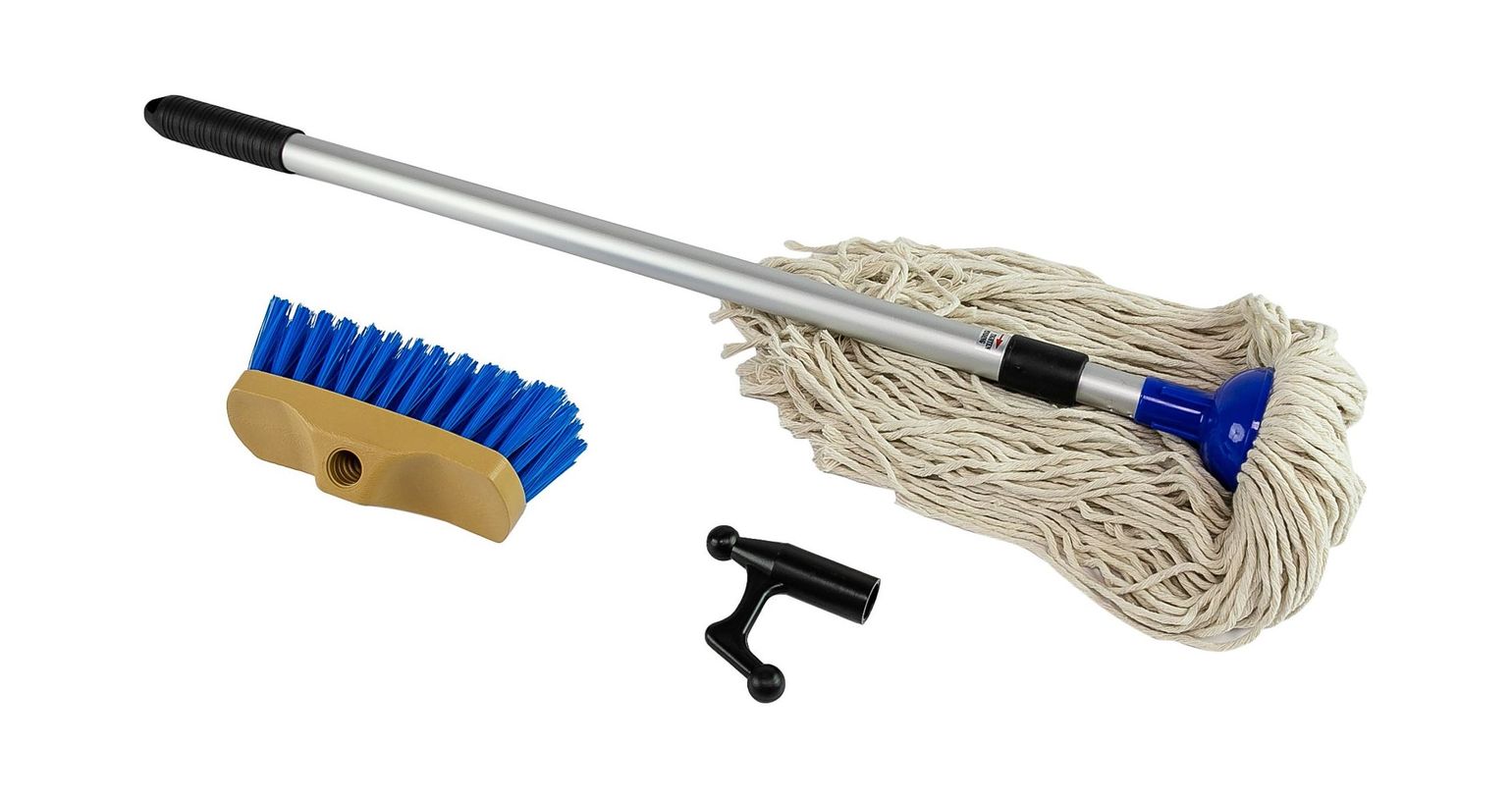 Набор для ухода за палубой судна. Включает в себя раздвижную алюминиевую рукоятку длиной до 122 см, щетку грубой очистки из синтетических волокон, швабру, пластиковый наконечник отпорного крюка.