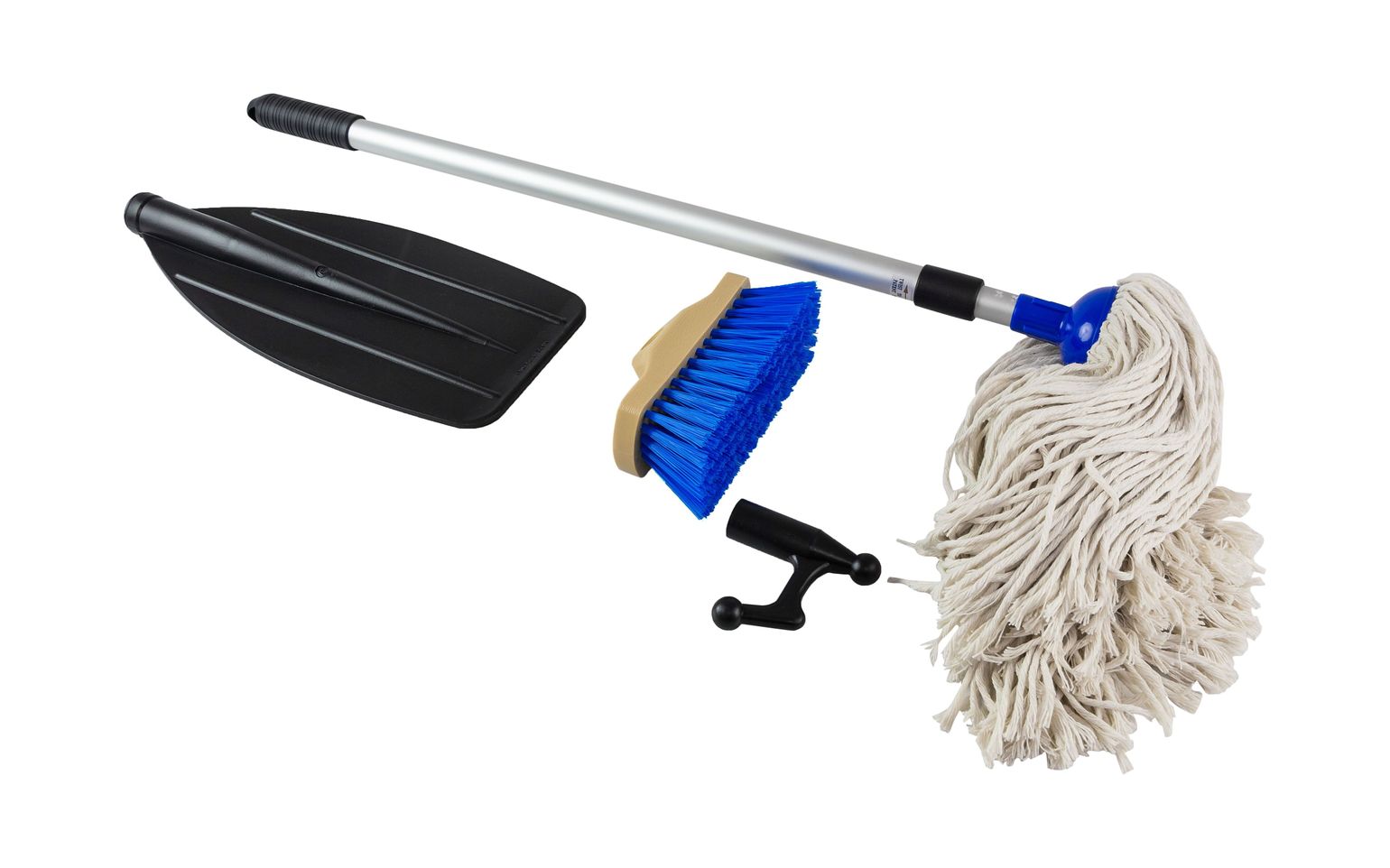 Набор для ухода за палубой судна. Включает в себя раздвижную алюминиевую рукоятку длиной 122 см, щетку грубой очистки из синтетических волокон, швабру, пластиковый наконечник отпорного крюка, пластиковую лопасть весла.