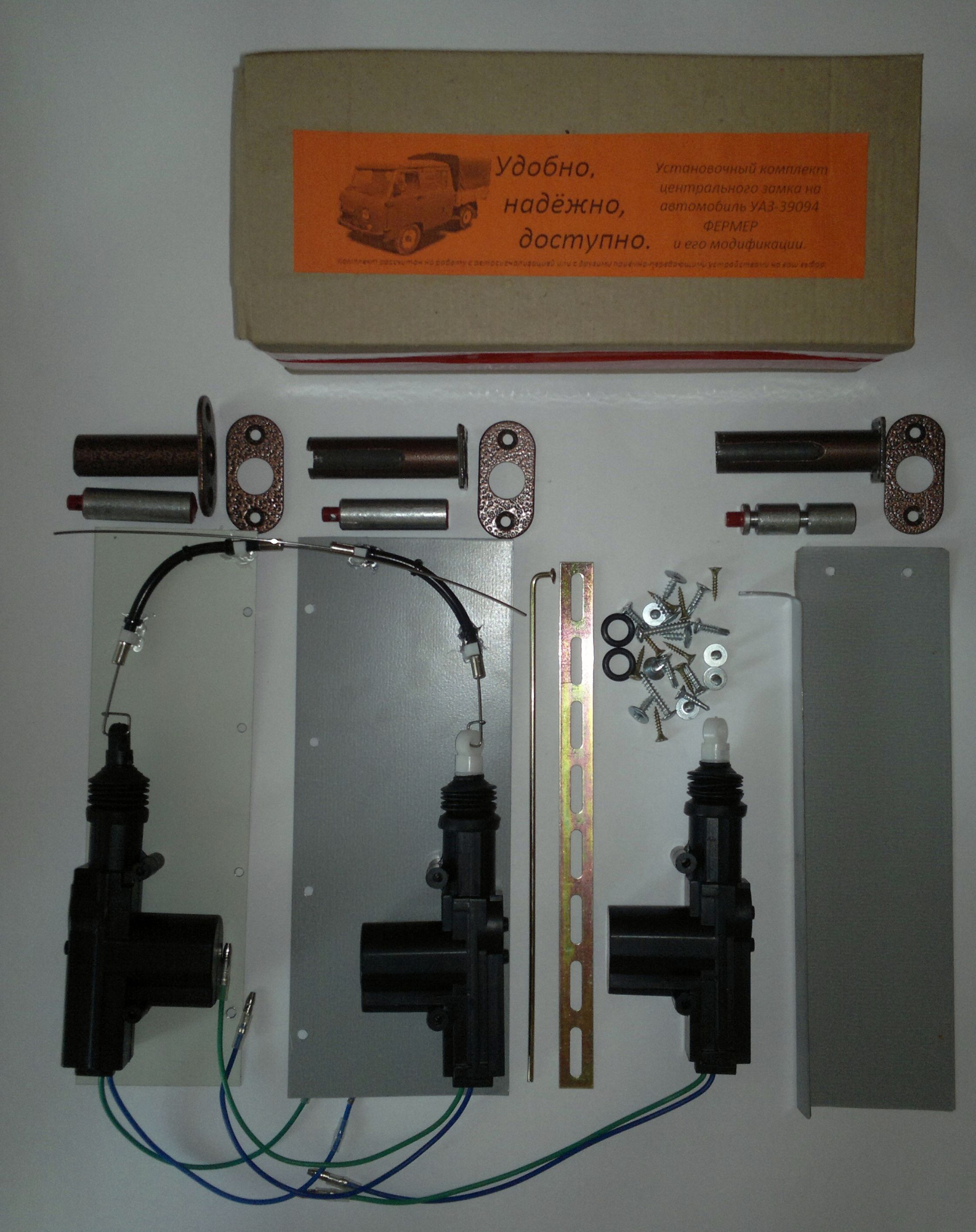 Комплект центрального замка на УАЗ-39094, это совершенно новый продукт на автомобильном рынке. Установка комплекта довольна проста и не занимает много времени. Комплект работает от автосигнализации или от других приёмно-передающих устройств. Автосигнализация или другие приёмно-передающие устройства в комплект не входят.