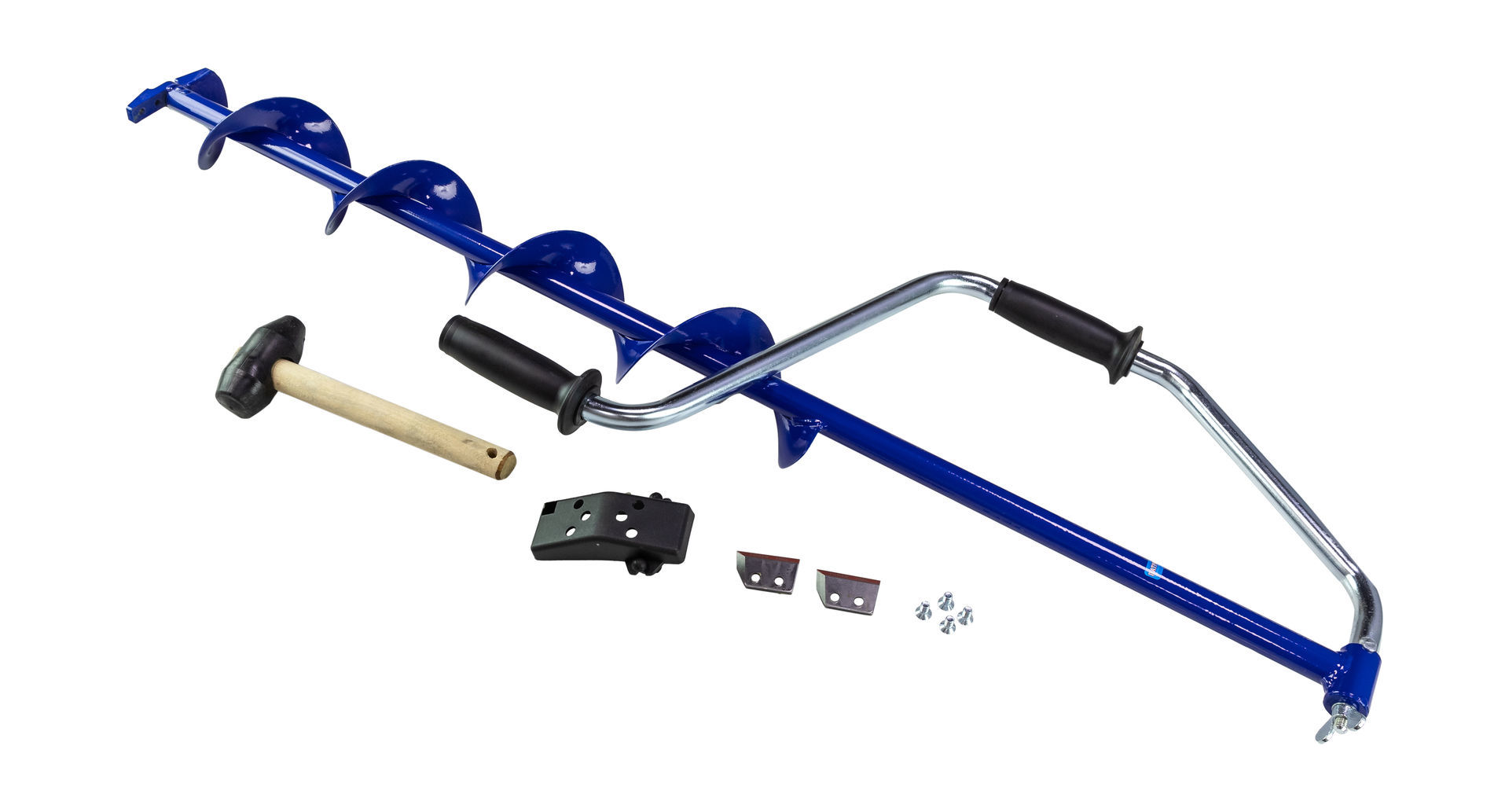 Металлический ледобур с цельнонавитым шнеком, надежное соединение ручки. Ножи, чехол для ножей и молоточек для отбивания льда в комплекте.