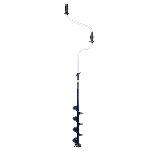 Такое расположение рукояток позволяет вращать ледобур одновременно двумя руками, тем самым, не прикладывая особых усилий, увеличивая скорость бурения лунок во льду.