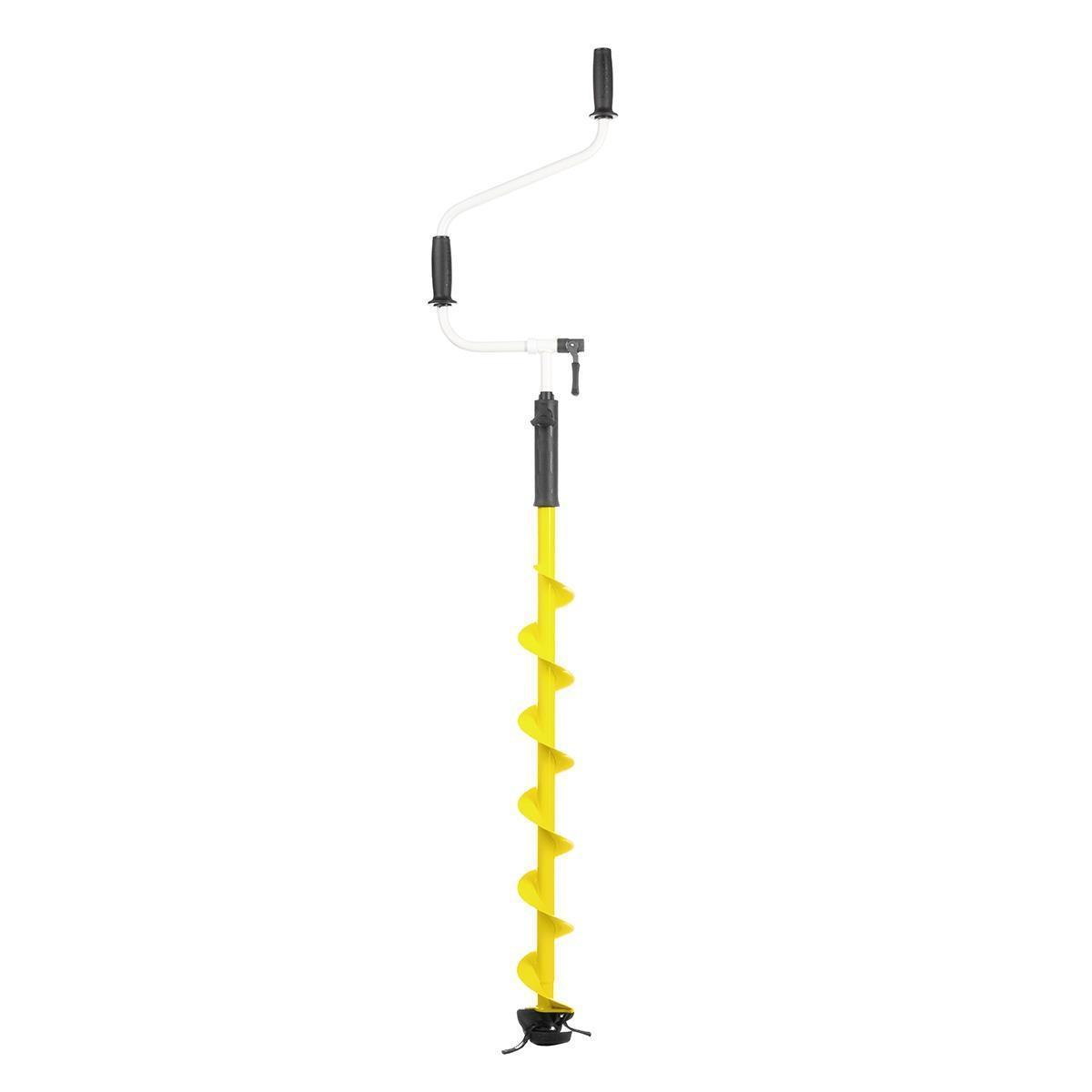 Верхняя и нижняя рукоятки ледобура смещены относительно оси шнека. Такое расположение рукояток позволяет вращать ледобур одновременно двумя руками, ход бура плавный, бурит без усилий.