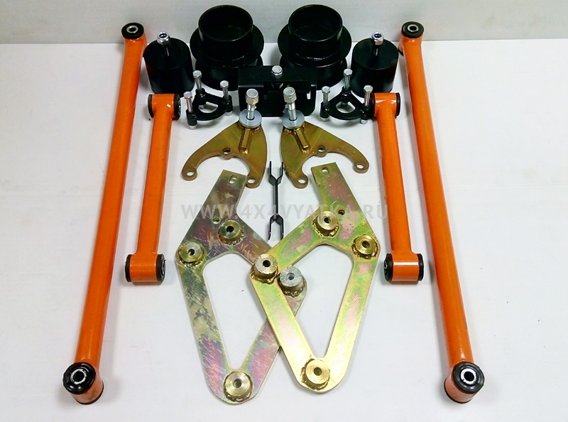 Для установки требуется несложная доработка штатных чашек с помощью дрели или болгарки. По-прежнему, в комплекте 4 реактивных тяги, а не две как у конкурентов. Присутствуют удлинители отбойников про которые многие почему-то забывают. Хотя их необходимость настолько важна, насколько дорога новая увеличенная резина. Без них новое увеличенное колесо рано или поздно встретиться с колесной аркой кузова.В комплекте проставка под родную поперечную тягу (Панара), а не безполезная регулируемая тяга.