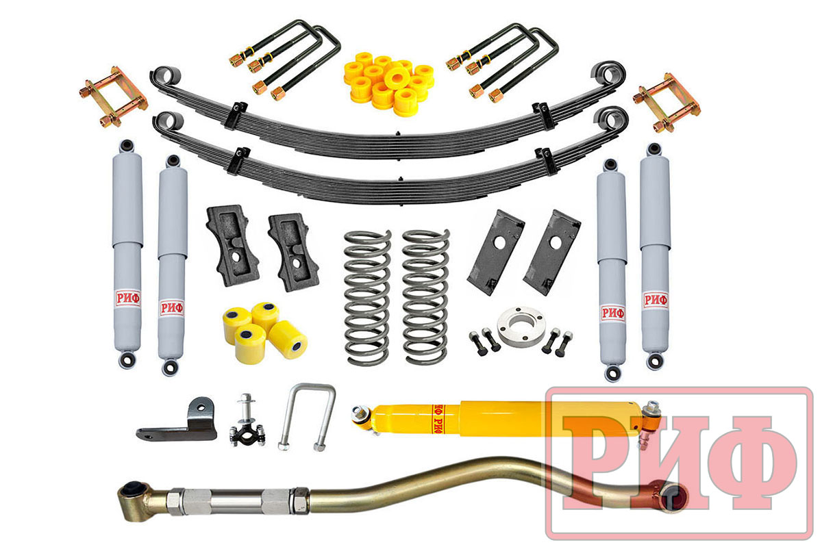Все компоненты лифт-комплектов РИФ разработаны специально для эксплуатации внедорожника в тяжелых условиях на различных дорожных покрытиях. Рессоры, амортизаторы с технологией Foam Cell и пружины РИФ не только компенсируют вес установленного на внедорожнике дополнительного оборудования (бамперов, порогов, дополнительных топливных баков, лебедок и прочего), но также существенно повышают грузоподъемность автомобиля. Удлиненные стремянки и серьги РИФ произведены из высококачественных материалов и имеют увеличенный запас прочности. Рессорные втулки РИФ изготовлены из полиуретана обладает высокой упругостью, износостойкостью и термоустойчивостью к высоким или низким температурам.