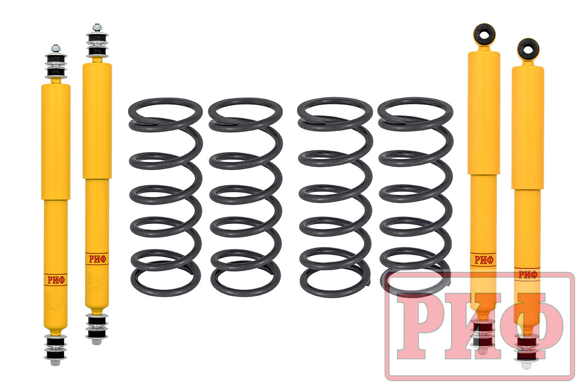Все компоненты лифт-комплектов РИФ разработаны специально для эксплуатации внедорожника в тяжелых условиях на различных дорожных покрытиях. Амортизаторы с технологией R-AIR и пружины РИФ не только компенсируют вес установленного на внедорожнике дополнительного оборудования (бамперов, порогов, дополнительных топливных баков, лебедок и прочего), но также существенно повышают грузоподъемность автомобиля.