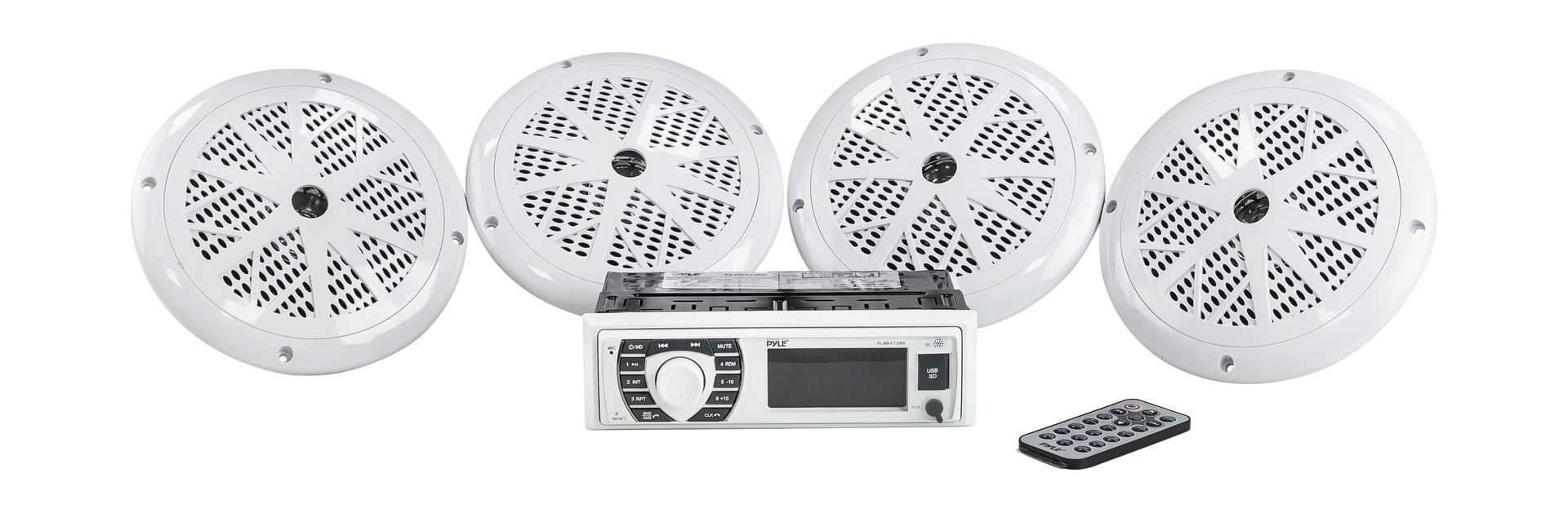 Данный аудиокомплект отличается от похожей модели PYLE количеством динамиков: четыре против двух в версии PLMRKT36WT. Стереорадиоприёмник и четыре водонепроницаемых колонки морского класса. Стандартный универсальный головной блок оснащён встроенным Bluetooth, радио с 30 каналами, USB для флэшкарт. С любых современных девайсов легко передавать аудио (будь то любимый mp3-плеер, смартфон либо планшет). Легкая беспроводная передача данных и возможность громкой связи благодаря встроенному микрофону на панели приёмника не позволят пропустить важные звонки, но вы будете слушать любимую музыку, аудиокниги или подкасты. Включайте любимые плейлисты удобным пультом дистанционного управления — на борту яхты, катера, лодки или за рулём квадроцикла. Четыре 5,25-дюймовых компонентных динамика обеспечат отличный полный спектр стереозвука и благодаря стандартным размерам могут быть легко и быстро установлены. Белый стильный дизайн прекрасно сочетается с цветом отделки многих морских судов. “Купил комплект взамен устаревшей аудиосистемы”, — делятся пользователи. “Неплохой звук, я доволен”, — также пишут в отзывах.