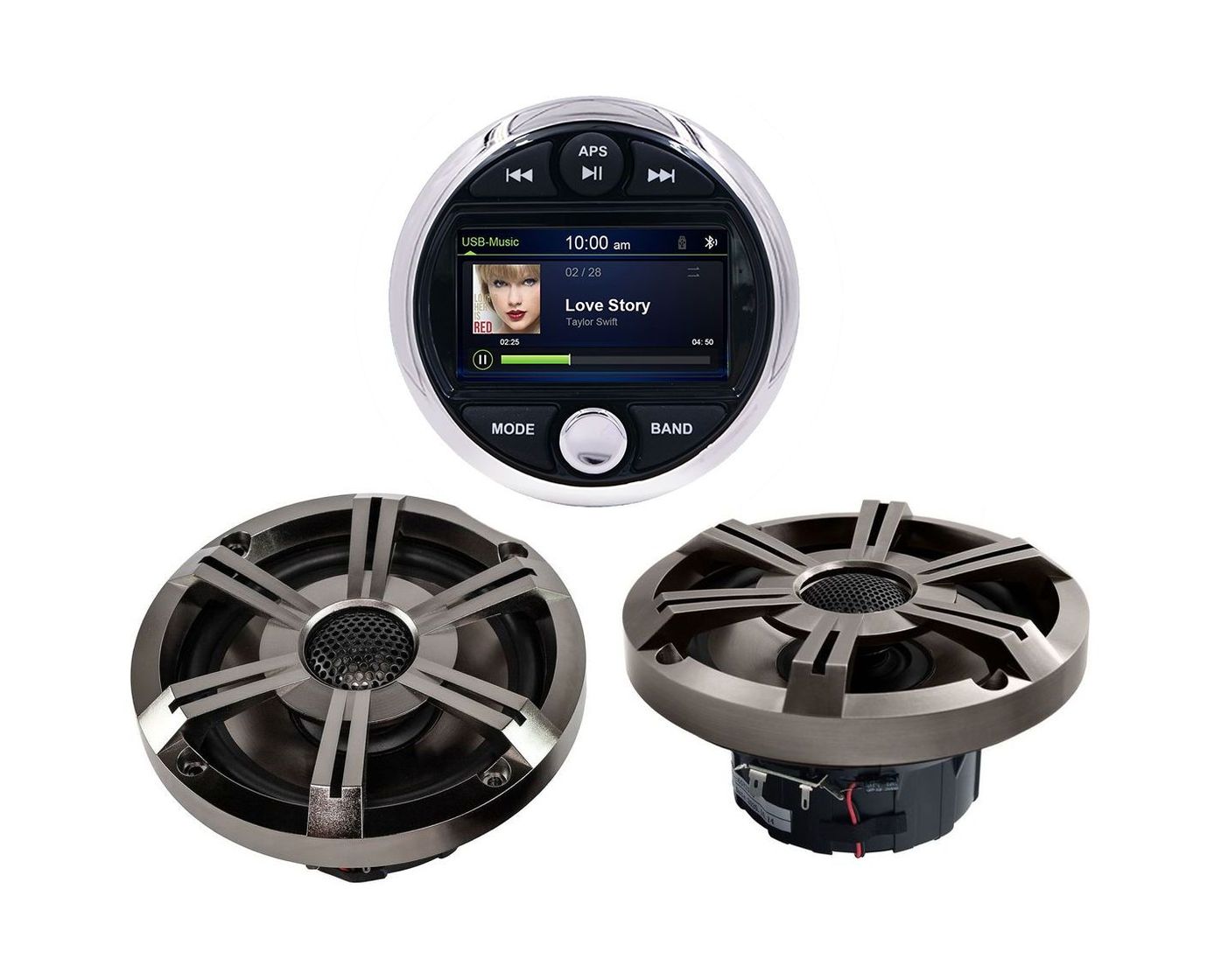 Комплект морской акустики состоит из головного устройства MRH301 с цветным дисплеем 3” и комплектом врезных динамиков MRH-65. Цифровая мультимедийная аудиосистема Marine Rocket создана специально для использования в морской среде. Это отличный выбор для установки на катер, яхту, квадроцикл или в открытой беседке. Влагозащищённое исполнение IPX6 позволит слушать музыку всюду, где бы вы ни находились. Устройство устойчиво к погодным условиям, не боится брызг воды, солнечных лучей, тряски, вибрации. Ключевые характеристики готового к установке на лодку/катер водостойкого комплекта: • Полноценный четырёхканальный усилитель с максимальной выходной мощностью 180 Вт (45 Вт на 4 канала). • Встроенный модуль Bluetooth A2DP для воспроизведения потокового аудио со смартфона или с музыкальных сервисов. • Zone Control: зональный аудиоконтроль позволит регулировать уровень громкости звука отдельно для каждой из трёх зон. • Отдельный канал для подключения активного сабвуфера с регулировкой сигнала. • Слот USB: подсоединяйте любые носители файлов MP3 или WMA, заряжайте планшет/телефон. • Дополнительный порт AUX для подключения иных накопителей или гаджетов. • Встроенный плеер MP5: кроме звука, ещё и видеофайлы. Видеовход и выход передадут изображение на внешний монитор, позволят подключить камеру заднего вида. • Радиотюнер в диапазонах AM/FM: уверенный приём сигнала не разлучит с новинками музыкальных радиостанций даже в дальних путешествиях. • Два двухполосных динамика диаметром 6,5” мощностью 2 × 120 Вт обеспечат хороший звук. • Звуковая катушка из алюминия; формованная корзина и гриль из прочного износостойкого ABS-пластика.