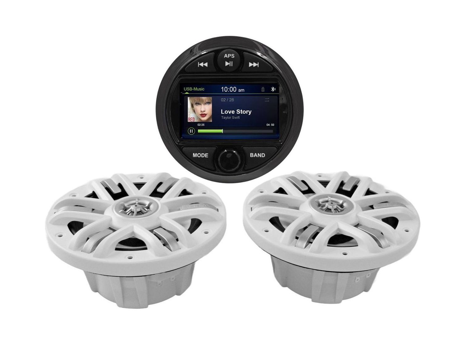 Комплект морской акустики состоит из головного устройства MRH301 с цветным дисплеем 3” и комплектом врезных динамиков MRH-65. Цифровая мультимедийная аудиосистема Marine Rocket создана специально для использования в морской среде. Это отличный выбор для установки на катер, яхту, квадроцикл или в открытой беседке. Влагозащищённое исполнение IPX6 позволит слушать музыку всюду, где бы вы ни находились. Устройство устойчиво к погодным условиям, не боится брызг воды, солнечных лучей, тряски, вибрации. Ключевые характеристики готового к установке на лодку/катер водостойкого комплекта: • Полноценный четырёхканальный усилитель с максимальной выходной мощностью 180 Вт (45 Вт на 4 канала). • Встроенный модуль Bluetooth A2DP для воспроизведения потокового аудио со смартфона или с музыкальных сервисов. • Zone Control: зональный аудиоконтроль позволит регулировать уровень громкости звука отдельно для каждой из трёх зон. • Отдельный канал для подключения активного сабвуфера с регулировкой сигнала. • Слот USB: подсоединяйте любые носители файлов MP3 или WMA, заряжайте планшет/телефон. • Дополнительный порт AUX для подключения иных накопителей или гаджетов. • Встроенный плеер MP5: кроме звука, ещё и видеофайлы. Видеовход и выход передадут изображение на внешний монитор, позволят подключить камеру заднего вида. • Радиотюнер в диапазонах AM/FM: уверенный приём сигнала не разлучит с новинками музыкальных радиостанций даже в дальних путешествиях. • Два двухполосных динамика диаметром 6,5” мощностью 2 × 120 Вт обеспечат хороший звук. • Звуковая катушка из алюминия; формованная корзина и гриль из прочного износостойкого ABS-пластика.