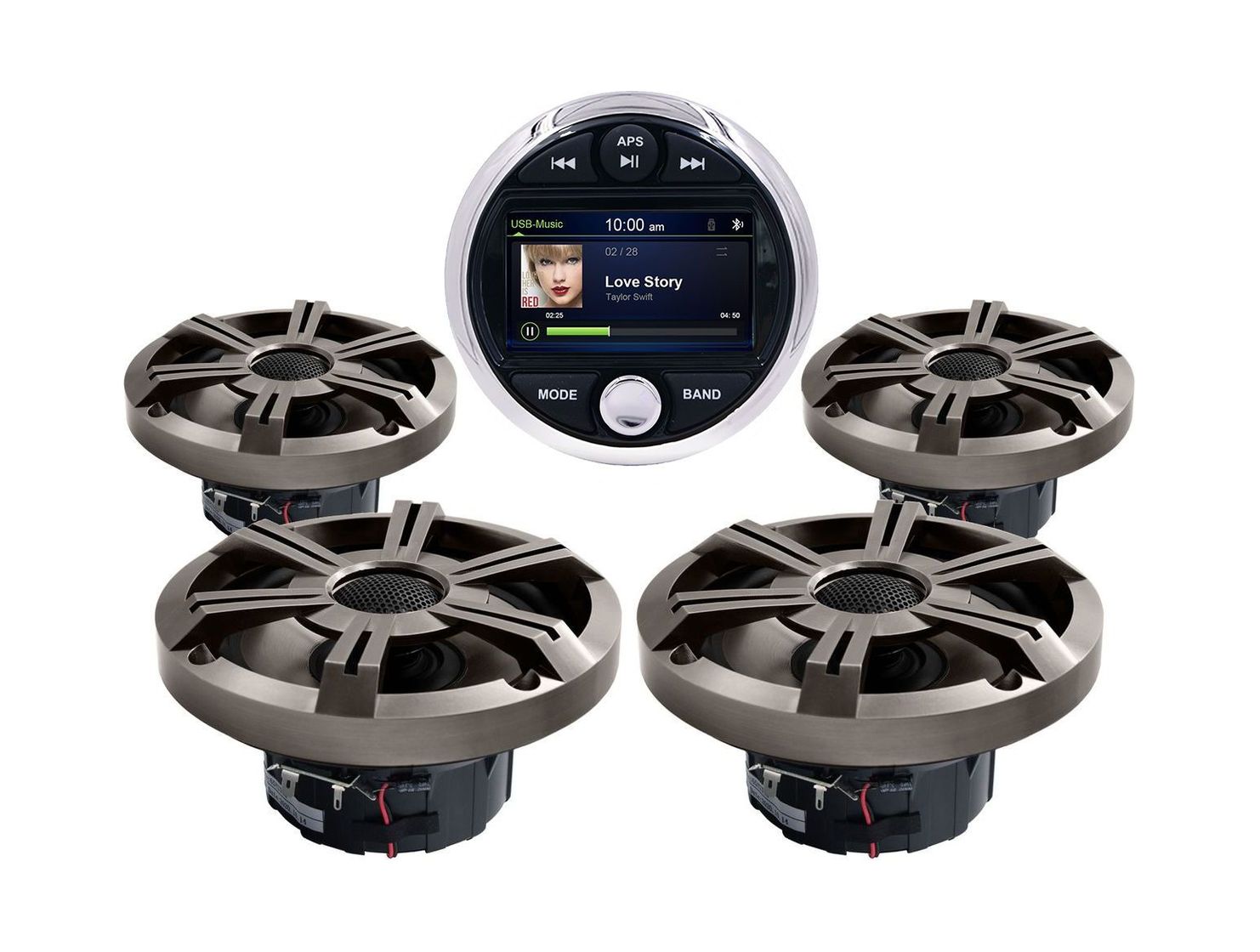 Комплект морской акустики состоит из головного устройства MRH301 с цветным дисплеем 3” и комплектом врезных динамиков MRH-65. Цифровая мультимедийная аудиосистема Marine Rocket создана специально для использования в морской среде. Это отличный выбор для установки на катер, яхту, квадроцикл или в открытой беседке. Влагозащищённое исполнение IPX6 позволит слушать музыку всюду, где бы вы ни находились. Устройство устойчиво к погодным условиям, не боится брызг воды, солнечных лучей, тряски, вибрации. Ключевые характеристики готового к установке на лодку/катер водостойкого комплекта: • Полноценный четырёхканальный усилитель с максимальной выходной мощностью 180 Вт (45 Вт на 4 канала). • Встроенный модуль Bluetooth A2DP для воспроизведения потокового аудио со смартфона или с музыкальных сервисов. • Zone Control: зональный аудиоконтроль позволит регулировать уровень громкости звука отдельно для каждой из трёх зон. • Отдельный канал для подключения активного сабвуфера с регулировкой сигнала. • Слот USB: подсоединяйте любые носители файлов MP3 или WMA, заряжайте планшет/телефон. • Дополнительный порт AUX для подключения иных накопителей или гаджетов. • Встроенный плеер MP5: кроме звука, ещё и видеофайлы. Видеовход и выход передадут изображение на внешний монитор, позволят подключить камеру заднего вида. • Радиотюнер в диапазонах AM/FM: уверенный приём сигнала не разлучит с новинками музыкальных радиостанций даже в дальних путешествиях. • Четыре двухполосных динамика диаметром 6,5” мощностью 4 × 120 Вт обеспечат хороший звук. • Звуковая катушка из алюминия; формованная корзина и гриль из прочного износостойкого ABS-пластика.