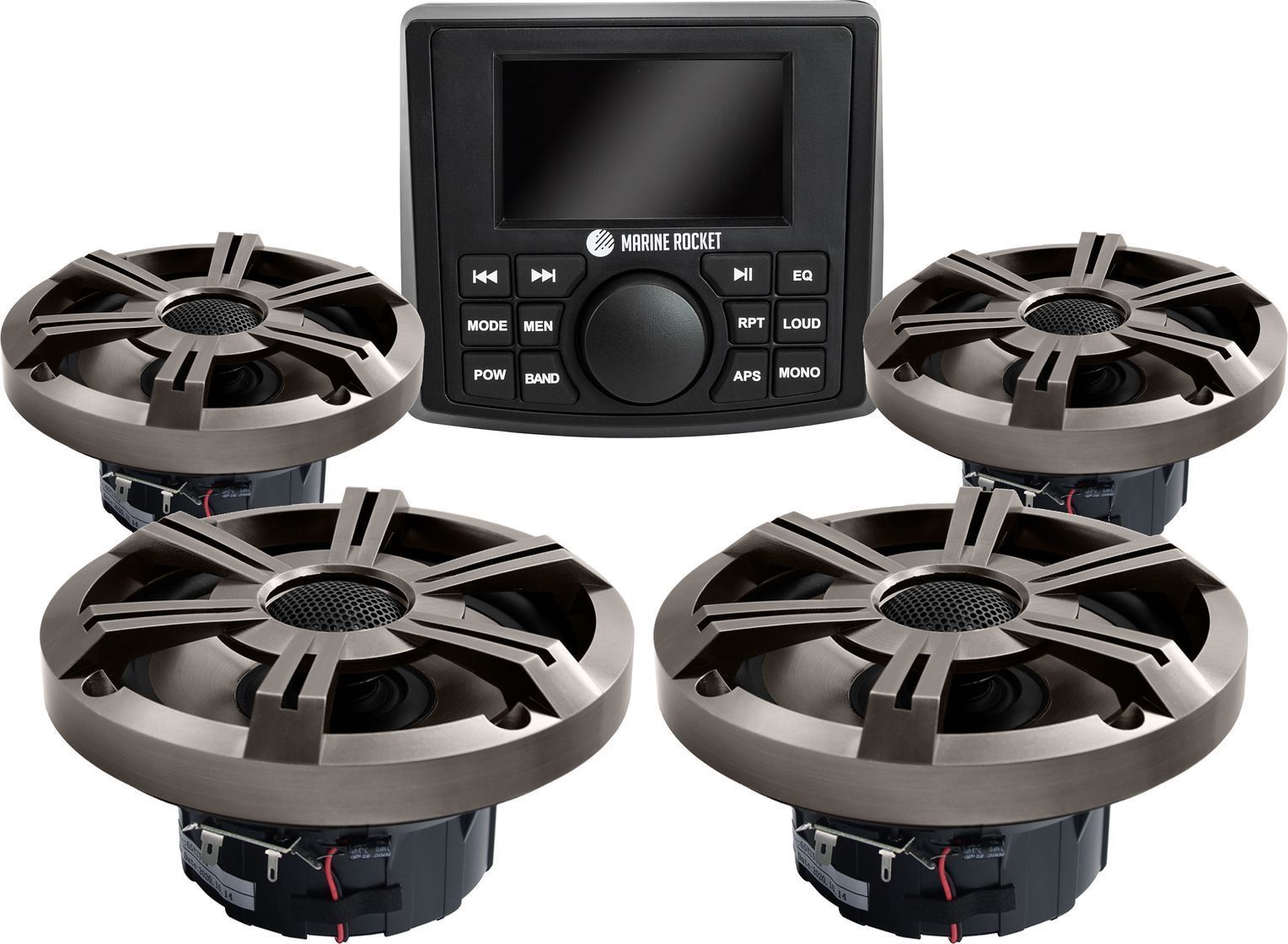 Комплект морской акустики состоит из головного устройства MRH335 с цветным дисплеем 3” и четырёх динамиков MRH-65DP (цвет «тёмная платина»). Цифровая мультимедийная аудиосистема Marine Rocket создана специально для использования в морской среде. Это отличный выбор для установки на катер, яхту, квадроцикл или в открытой беседке. Влагозащищённое исполнение IPX6 позволит слушать музыку всюду, где бы вы ни находились. Устройство устойчиво к погодным условиям, не боится брызг воды, солнечных лучей, тряски, вибрации. Ключевые характеристики готового к установке на лодку/катер водостойкого комплекта: • Полноценный четырёхканальный усилитель с максимальной выходной мощностью 180 Вт (45 Вт на 4 канала). • Встроенный модуль Bluetooth A2DP для воспроизведения потокового аудио со смартфона или с музыкальных сервисов. • Слот USB: подсоединяйте любые носители файлов MP3 или WMA, заряжайте планшет/телефон. • Дополнительный порт AUX для подключения иных накопителей или гаджетов. • Встроенный плеер MP5: кроме звука, ещё и видеофайлы. Видеовход и выход передадут изображение на внешний монитор, позволят подключить камеру заднего вида. • Радиотюнер в диапазонах AM/FM: уверенный приём сигнала не разлучит с новинками музыкальных радиостанций даже в дальних путешествиях. • Четыре двухполосных динамика диаметром 6,5” мощностью 4 × 120 Вт обеспечат хороший звук. • Звуковая катушка из алюминия; формованная корзина и гриль из прочного износостойкого ABS-пластика.