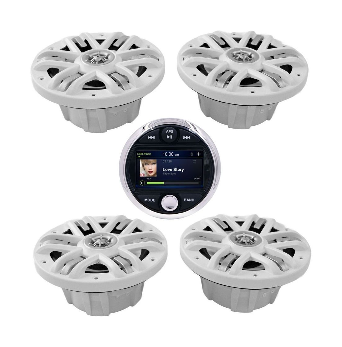 Комплект морской акустики состоит из головного устройства MRH301 с цветным дисплеем 3” и комплектом врезных динамиков MRH-65. Цифровая мультимедийная аудиосистема Marine Rocket создана специально для использования в морской среде. Это отличный выбор для установки на катер, яхту, квадроцикл или в открытой беседке. Влагозащищённое исполнение IPX6 позволит слушать музыку всюду, где бы вы ни находились. Устройство устойчиво к погодным условиям, не боится брызг воды, солнечных лучей, тряски, вибрации. Ключевые характеристики готового к установке на лодку/катер водостойкого комплекта: • Полноценный четырёхканальный усилитель с максимальной выходной мощностью 180 Вт (45 Вт на 4 канала). • Встроенный модуль Bluetooth A2DP для воспроизведения потокового аудио со смартфона или с музыкальных сервисов. • Zone Control: зональный аудиоконтроль позволит регулировать уровень громкости звука отдельно для каждой из трёх зон. • Отдельный канал для подключения активного сабвуфера с регулировкой сигнала. • Слот USB: подсоединяйте любые носители файлов MP3 или WMA, заряжайте планшет/телефон. • Дополнительный порт AUX для подключения иных накопителей или гаджетов. • Встроенный плеер MP5: кроме звука, ещё и видеофайлы. Видеовход и выход передадут изображение на внешний монитор, позволят подключить камеру заднего вида. • Радиотюнер в диапазонах AM/FM: уверенный приём сигнала не разлучит с новинками музыкальных радиостанций даже в дальних путешествиях. • Четыре двухполосных динамика диаметром 6,5” мощностью 4 × 120 Вт обеспечат хороший звук. • Звуковая катушка из алюминия; формованная корзина и гриль из прочного износостойкого ABS-пластика.