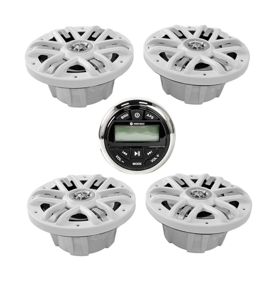 Комплект морской акустики состоит из головного устройства MRH833 с дисплеем и четырех динамиков MRH-65. Цифровая мультимедийная аудиосистема Marine Rocket создана специально для использования в морской среде. Это отличный выбор для установки на катер, яхту, квадроцикл или в открытой беседке. Влагозащищённое исполнение IPX6 позволит слушать музыку всюду, где бы вы ни находились. Устройство устойчиво к погодным условиям, не боится брызг воды, солнечных лучей, тряски, вибрации. Ключевые характеристики готового к установке на лодку/катер водостойкого комплекта: • Полноценный четырёхканальный усилитель с максимальной выходной мощностью 180 Вт (45 Вт на 4 канала). • Встроенный модуль Bluetooth A2DP для воспроизведения потокового аудио со смартфона или с музыкальных сервисов. • Слот USB: подсоединяйте любые носители файлов MP3 или WMA, заряжайте планшет/телефон. • Дополнительный порт AUX для подключения иных накопителей или гаджетов. • Радиотюнер в диапазонах AM/FM: уверенный приём сигнала не разлучит с новинками музыкальных радиостанций даже в дальних путешествиях. • Четыре двухполосных динамика диаметром 6,5” мощностью 4 × 120 Вт обеспечат хороший звук. • Звуковая катушка из алюминия; формованная корзина и гриль из прочного износостойкого ABS-пластика.