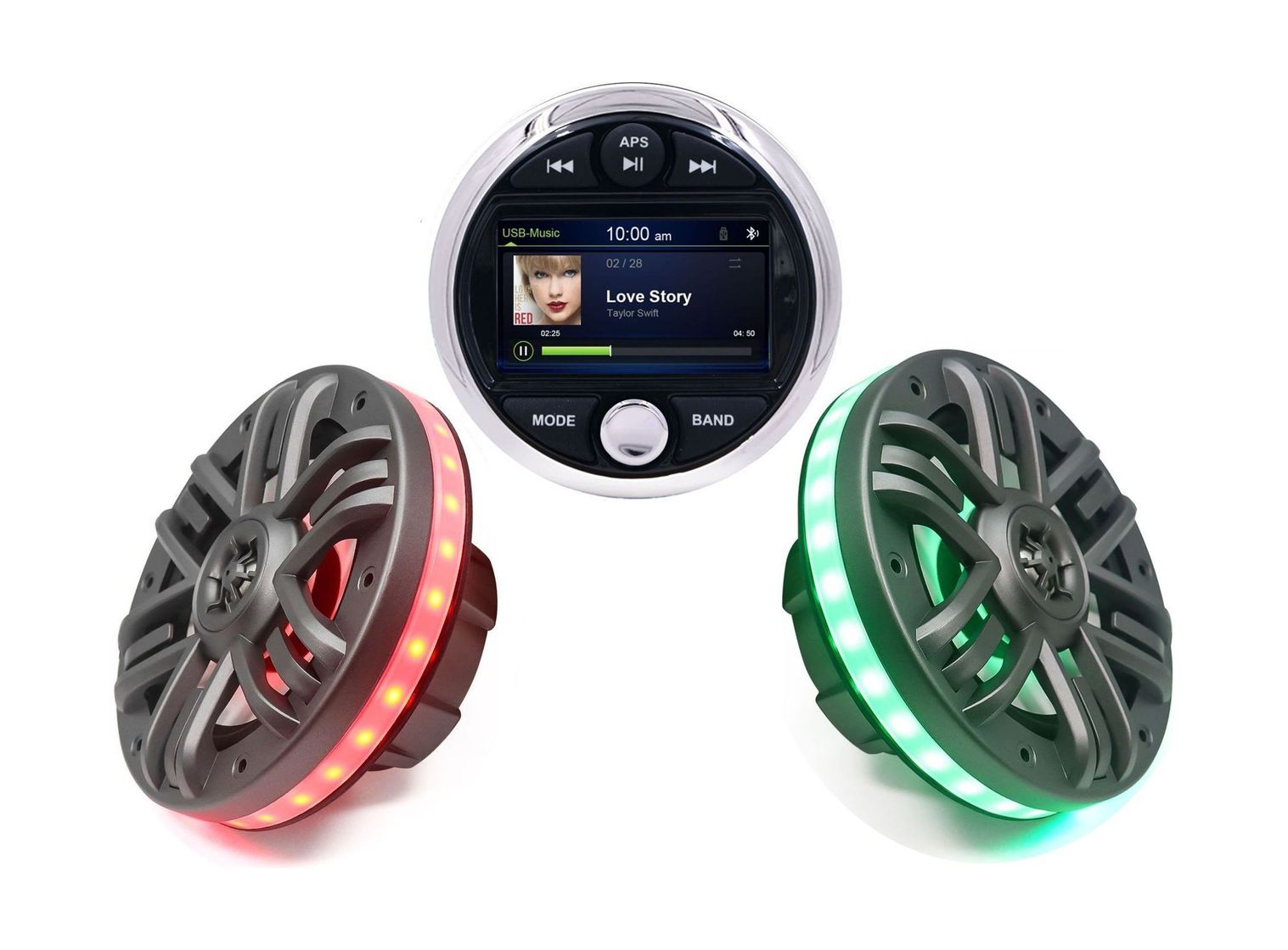 Комплект морской акустики состоит из головного устройства MRH301 с цветным дисплеем 3” и комплектом врезных динамиков M165KMR. Цифровая мультимедийная аудиосистема Marine Rocket создана специально для использования в морской среде. Это отличный выбор для установки на катер, яхту, квадроцикл или в открытой беседке. Влагозащищённое исполнение IPX6 позволит слушать музыку всюду, где бы вы ни находились. Устройство устойчиво к погодным условиям, не боится брызг воды, солнечных лучей, тряски, вибрации. Ключевые характеристики готового к установке на лодку/катер водостойкого комплекта: • Полноценный четырёхканальный усилитель с максимальной выходной мощностью 180 Вт (45 Вт на 4 канала). • Встроенный модуль Bluetooth A2DP для воспроизведения потокового аудио со смартфона или с музыкальных сервисов. • Zone Control: зональный аудиоконтроль позволит регулировать уровень громкости звука отдельно для каждой из трёх зон. • Отдельный канал для подключения активного сабвуфера с регулировкой сигнала. • Слот USB: подсоединяйте любые носители файлов MP3 или WMA, заряжайте планшет/телефон. • Дополнительный порт AUX для подключения иных накопителей или гаджетов. • Встроенный плеер MP5: кроме звука, ещё и видеофайлы. Видеовход и выход передадут изображение на внешний монитор, позволят подключить камеру заднего вида. • Радиотюнер в диапазонах AM/FM: уверенный приём сигнала не разлучит с новинками музыкальных радиостанций даже в дальних путешествиях. • Два двухполосных динамика диаметром 6,5” мощностью 2 × 120 Вт обеспечат хороший звук. • RGB - подсветка внутри и снаружи динамика с управлением через Bluetooth смартфона. • Звуковая катушка из алюминия; формованная корзина и гриль из прочного износостойкого ABS-пластика.