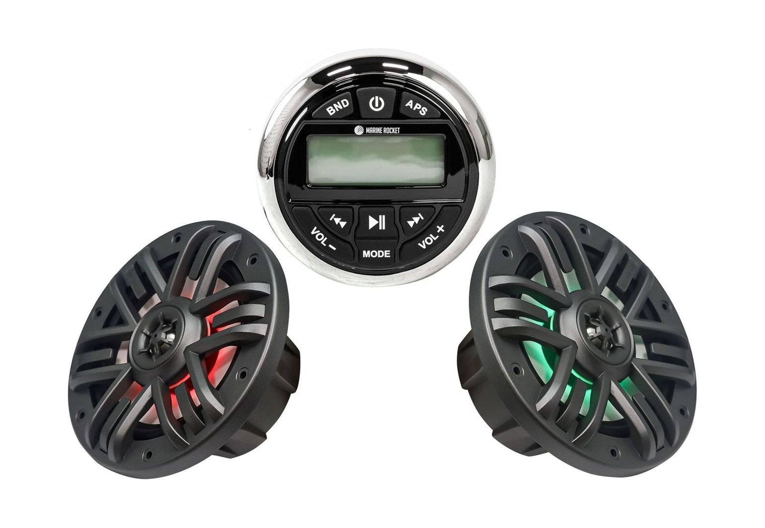 Комплект морской акустики состоит из головного устройства MRH833 с дисплеем и двух динамиков M165MR. Цифровая мультимедийная аудиосистема Marine Rocket создана специально для использования в морской среде. Это отличный выбор для установки на катер, яхту, квадроцикл или в открытой беседке. Влагозащищённое исполнение IPX6 позволит слушать музыку всюду, где бы вы ни находились. Устройство устойчиво к погодным условиям, не боится брызг воды, солнечных лучей, тряски, вибрации. Ключевые характеристики готового к установке на лодку/катер водостойкого комплекта: • Полноценный четырёхканальный усилитель с максимальной выходной мощностью 180 Вт (45 Вт на 4 канала). • Встроенный модуль Bluetooth A2DP для воспроизведения потокового аудио со смартфона или с музыкальных сервисов. • Слот USB: подсоединяйте любые носители файлов MP3 или WMA, заряжайте планшет/телефон. • Дополнительный порт AUX для подключения иных накопителей или гаджетов. • Радиотюнер в диапазонах AM/FM: уверенный приём сигнала не разлучит с новинками музыкальных радиостанций даже в дальних путешествиях. • Пара двухполосных динамиков диаметром 6,5” мощностью 2 × 120 Вт обеспечат хороший звук. • RGB - подсветка внутри динамика с управлением через Bluetooth смартфона. • Звуковая катушка из алюминия; формованная корзина и гриль из прочного износостойкого ABS-пластика.