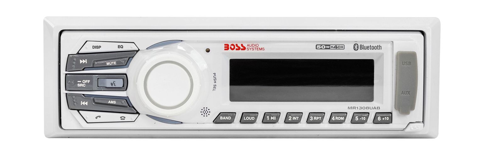 Морская влагозащищенная магнитола MR1308UAB от американской компании Boss Audio — воспроизводит музыкальные треки формата MP3/WMA, имеет USB/AUX выходы, поддерживает Bluetooth. - Максимальная мощность 200 Вт (4 х 50 Вт) - Bluetooth (передача звука со смартфона, приём звонков) - Вход 3,5 мм jack + AUX (передняя панель) - USB-порт (передняя панель) - Цифровой радио тюнер (FM/AM) - Съемная передняя панель - Пульт ДУ в комплекте - Balance/Fader/Bass/Treble + эквалайзер (предустановленный) - Отображение времени на дисплее - Защитное покрытие передней панели от UV излучения - Функция запоминания радио или MP3 в случае отключения питания