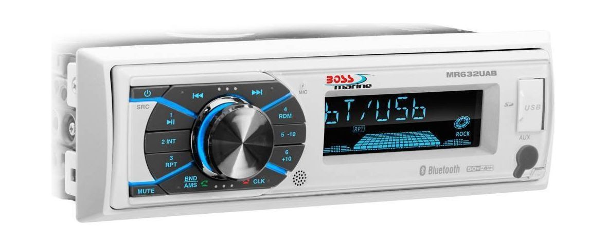 Морской мультимедийный проигрыватель MR632UAB без CD/DVD механизма. Воспроизводит аудио в формате MP3/WMA со смартфонов, планшетов, МР3-плееров, CD-накопителей, а также потоковое аудио через Bluetooth соединение. Для проводного соединения на передней панели расположен 3мм Aux-вход, USB-порт и CD-слот. Выходы предусилителя дают возможность улучшить качество звучания музыкальной системы путем подключения дополнительных усилителей мощности. Bluetooth соединение может быть использовано для принятия и осуществления телефонных звонков (громкая связь), а встроенный тюнер дает доступ к прослушиванию радиостанций в FM/AM диапазоне (предустановки тюнера 18FM/12AM). Съемная лицевая панель имеет защитное покрытие от UV-излучений — данное решение убережет вашу магнитолу от вредных воздействий окружающей среды и от покушений вандалов. Степень гидроизоляции позволяет использовать ресивер MR632UAB на открытом воздухе при высоком уровне влажности. Отсутствие в конструкции CD/DVD-проигрывателя заметно облегчает модель и сам процесс ее монтажа. Удобная раскладка кнопок управления позволяет держать все под контролем даже во время движения. Общая мощность головного устройства составляет 200 Вт (50 Вт х 4), доступна регулировка Balance/Fader/Bass/Treble, есть встроенный эквалайзер с предварительными установками. Сдержанный стильный дизайн впишется в любой интерьер транспортного средства. Внешний вид далек от минимализма, однако, удобное расположение функциональных деталей облегчит эксплуатацию данной модели. Лицевая панель условно поделена на два блока: площадка с кнопками управления — с одной стороны, и информационный дисплей с разъемами — с другой. На экране может отображаться информация о радиостанции, название трека, время и другие данные для пользователя. Используемый тип шасси головного устройства представлен в стандартном формате 1 DIN, размеры штатного места для монтажа (Д х Гх В) составляют 18,10 x 10,16 x 5,40 (см). Для бесперебойной работы необходимо обеспечить питание в 12В.