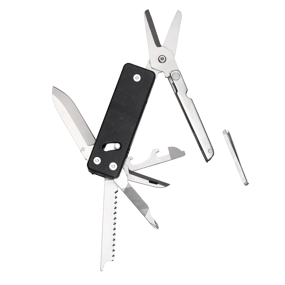 Шило проткнет даже плотную мешковину. В функционал инструмента также добавлена дополнительная особенность: если предстоит работа с необработанной древесиной, кромку шила можно применить в роли стамески. Торцевая часть оснащена стеклобоем с твердостью 60 HRC. Малозаметная деталь поможет в случае, если понадобится экстренно разбить стекло. Как в стандартном мультиинструменте, также добавлены 2 открывалки для бутылок и для консерв. На конце расположена плоская отвертка, к которой приложен держатель с 12 битами. Сбоку рукоятки есть глубокая клипса, чтобы цеплять мультиинструмент на ремень.