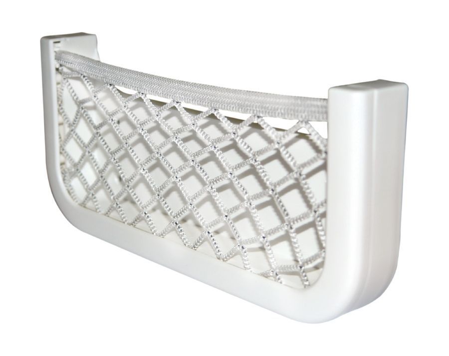 Сетка для хранения предметов. Рама из белого Абс-пластика с эластичной сеткой из плетеного нейлона. Крепится на самоклеящуюся тыльную часть либо посредством четырех шурупов.