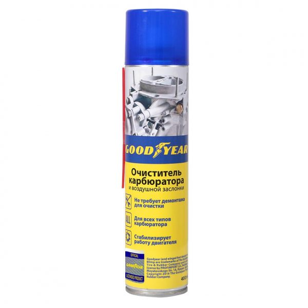 Очиститель карбюратора и воздушной заслонки Goodyear позволяет эффективно и без демонтажа очистить элементы карбюратора и воздушной заслонки от всех видов углеродных отложений (нагар, смолы или масляные пленки). Очиститель карбюратора и воздушной заслонки Goodyear позволяет эффективно и без демонтажа очистить элементы карбюратора и воздушной заслонки от всех видов углеродных отложений (нагар, смолы или масляные пленки). Очищает топливные камеры, игольчатый клапан, жиклеры, восстанавливает подвижность оси воздушной заслонки.