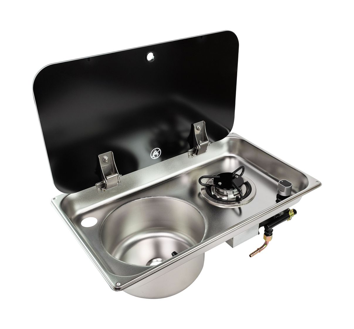 Компактная комбинация встраиваемой варочной панели с мойкой, расположенной слева от газовой конфорки. Стильная плита выполнена из нержавеющей стали и снабжена практичной безопасной крышкой из стекла. Когда мойка и конфорка не используются, откидную крышку можно опустить. Таким образом, в ограниченном пространстве камбуза на катере или яхте либо в автодоме, жилом прицепе можно обустроить дополнительное место и использовать его как столешницу. Эта продуманная и удобная конструкция безопасна: есть устройство отключения пламени, стекло — жаропрочное, а опоры для посуды легко снимаются для очистки. Горелка мощностью 1.8 кВт работает на сжиженном газе.