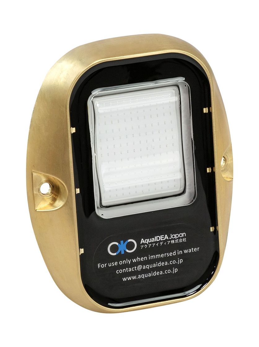Герметичный огонь для подводного освещения катера или лодки. Латунный корпус, закаленное стекло, мощные светодиоды COB LED, 12 В, 30 Вт. Цвет свечения - синий.