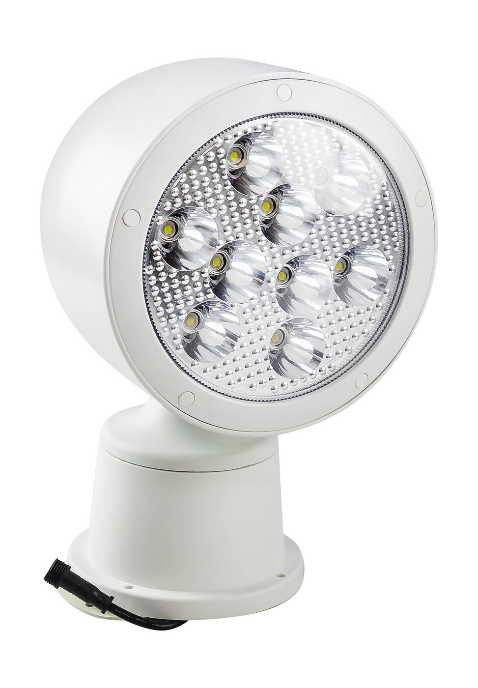 Палубный прожектор стационарной установки. Оснащен беспроводным пультом дистанционным управлением. Радиус действия пульта 50 метров. Угол луча 110° Длина кабеля питания 4 метра. Угол поворота 340°, угол подъема-опускания - 70° (вверх - 48°, вниз - 22°).