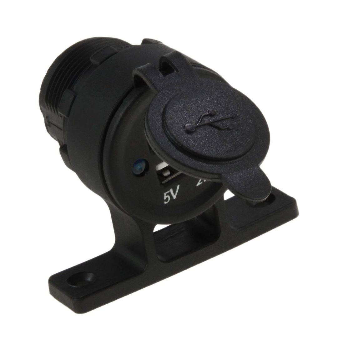 USB разъем на два порта с кронштейном. Служит для питания и зарядки электронных гаджетов. Изготовлен из высокопрочного пластика. Выходное напряжение 5 В. Для защиты разъемов от пыли и брызг комплектуется резиновой крышкой.