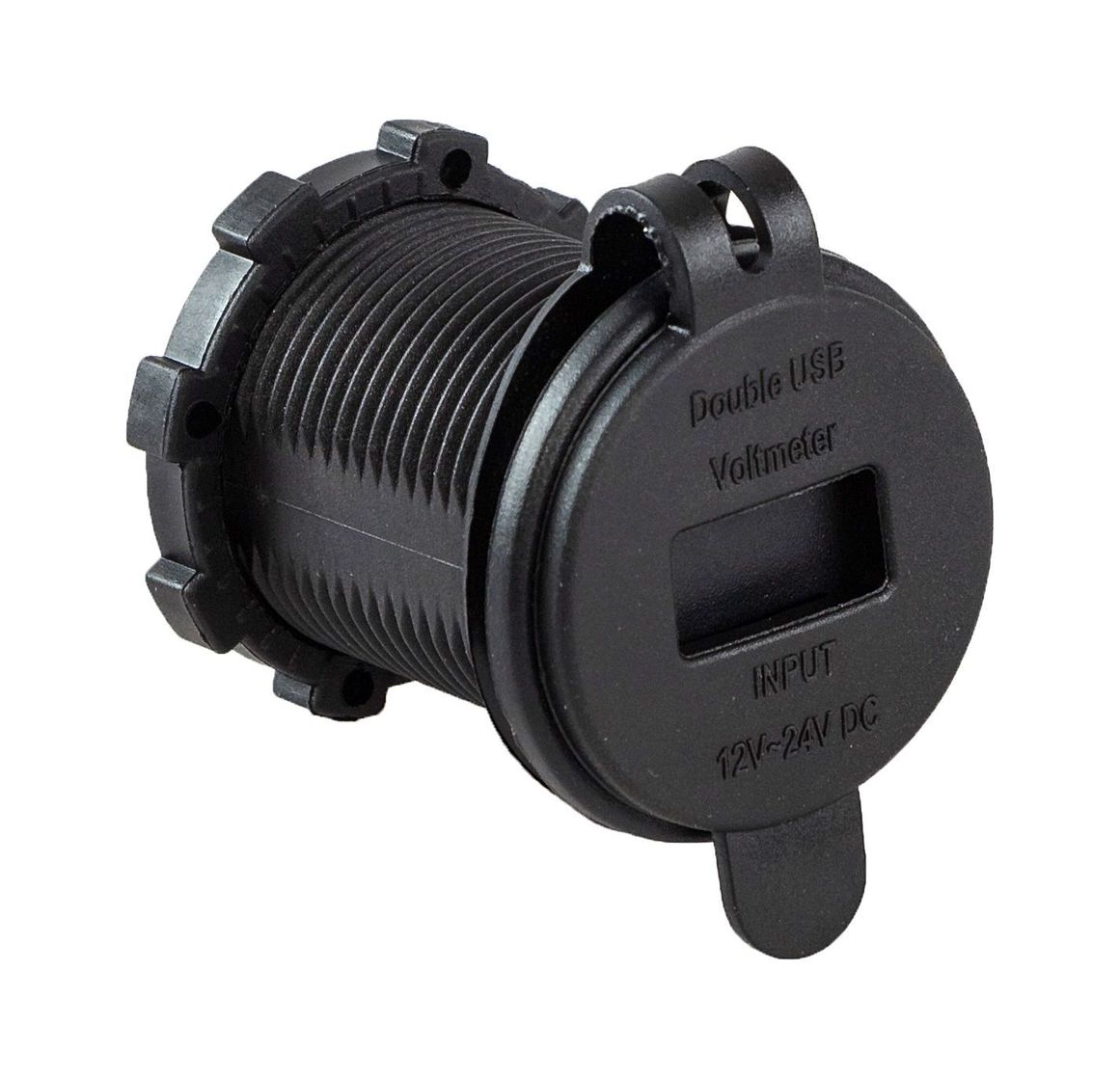 Врезной USB разъем на два порта плюс цифровой вольтметр. Служит для питания и зарядки электронных гаджетов, а также для контроля напряжения бортовой сети. Изготовлен из высокопрочного пластика. Выходное напряжение 5 В. Для защиты разъемов от пыли и брызг комплектуется резиновой крышкой.