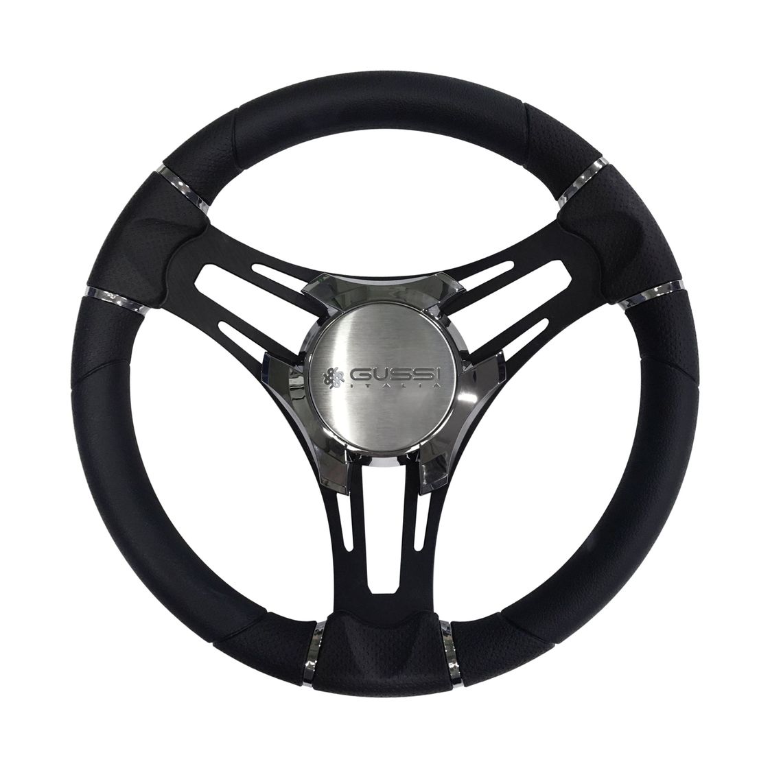 Рулевое колесо от итальянского производителя Gussi, выполнено из полиуретана в современном стиле и представляет собой отличное соотношение цены и качества. Колеса Gussi поставляются с конусной посадкой на вал редуктора, фиксируется шпонкой. Такая посадка является очень распространенной и подходит к большинству рулевых валов.