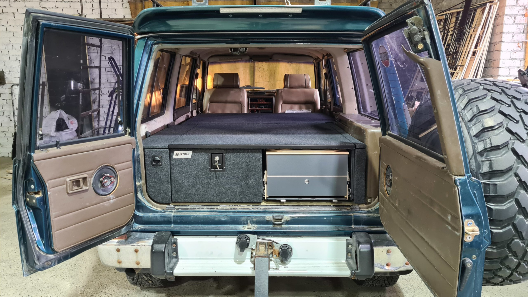 Небольшие дверцы по бокам органайзера открывающиеся на 180 градусов, предоставляют доступ к автомобильным аркам, где вы можете хранить компрессор, трос, аптечку и опционально — экспедиционные лопаты, топоры — удобное решение, чтобы на 100% использовать пространство багажника и сохранить эстетический вид и порядок.