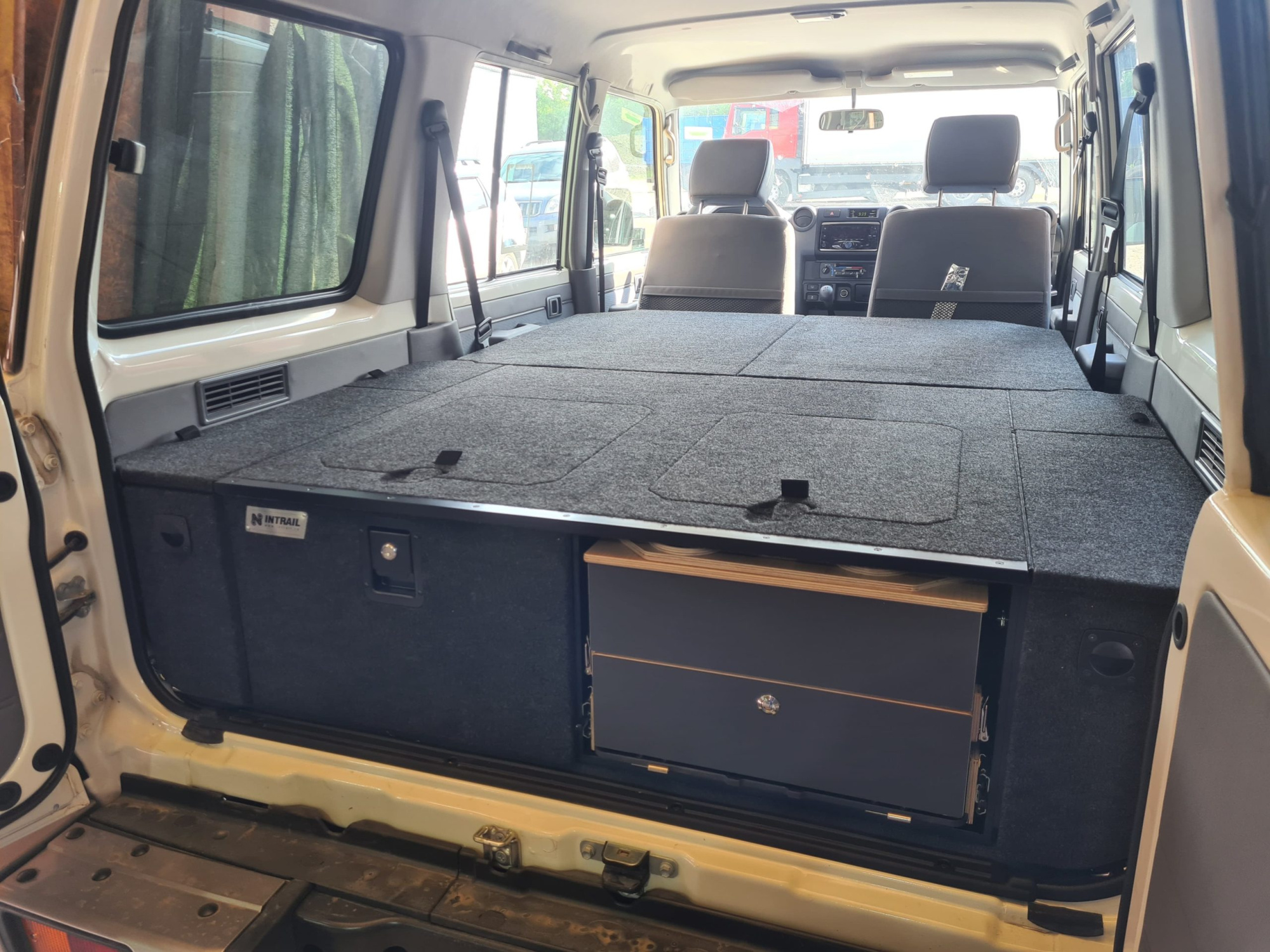 Спальник-органайзер для багажника автомобиля Toyota Land Cruiser 76 выполнен из влагостойкой, ламинированной березовой фанеры.