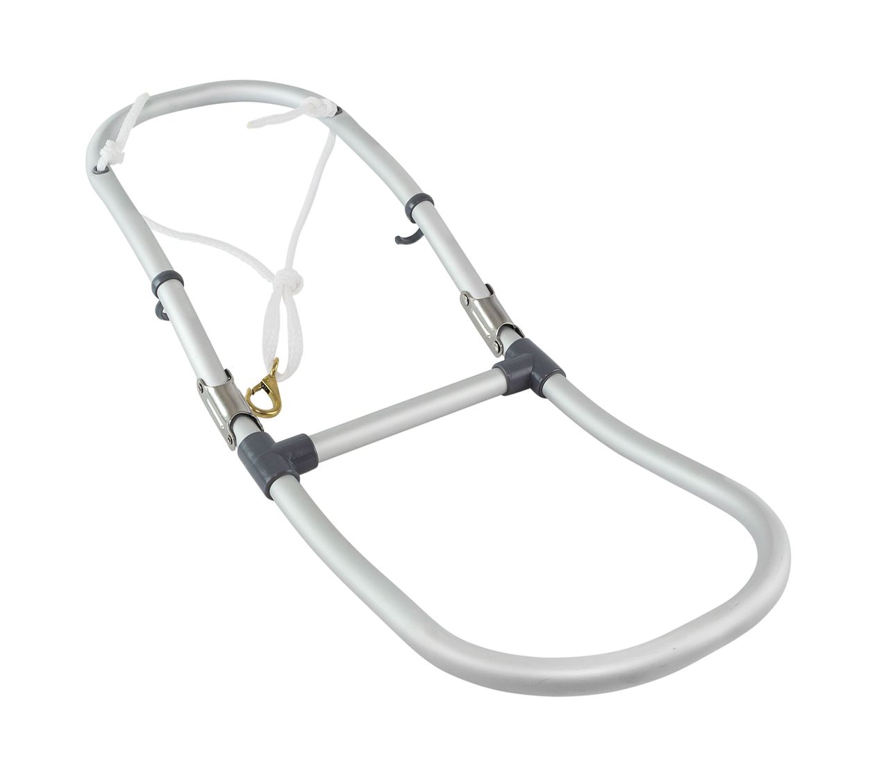 Складной трап для надувной лодки. Изготовлен из анодированного алюминия. Крепится к лодке с помощью прочного шнура с карабином.