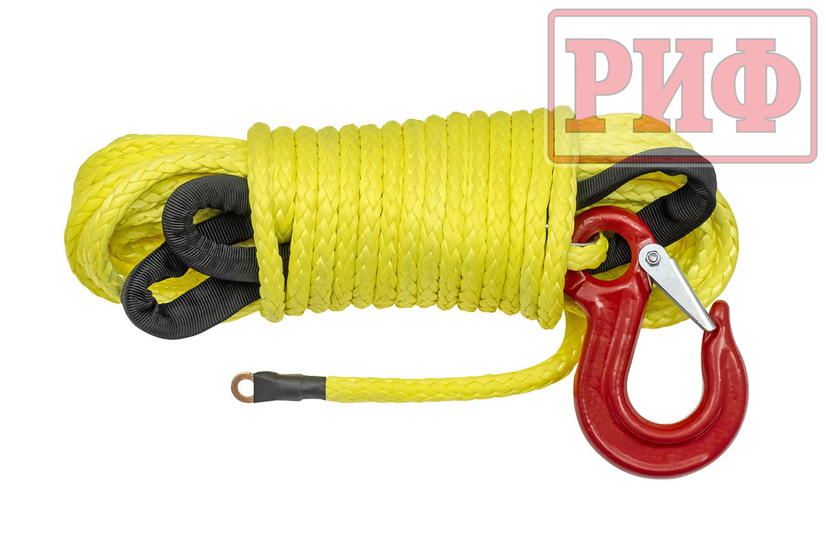 Синтетический трос РИФ изготовлен из волокон Dyneema и также прочен, как стальной, но при этом он очень легкий, износостойки и абсолютно безопасный в использовании – даже если он порвется под нагрузкой, тяжелых травм человеку и автомобилю не нанесет благодаря мягкости и маленькому весу.