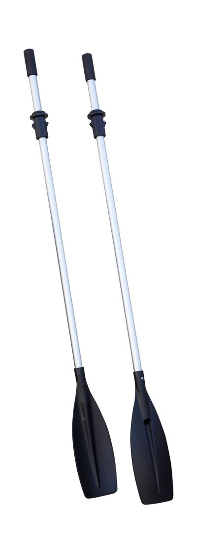 Комплект из двух весел. Лопасть изготовлена из прочного пластика. Цевье из анодированного алюминия. Диаметр посадочного места под уключину 54 мм.