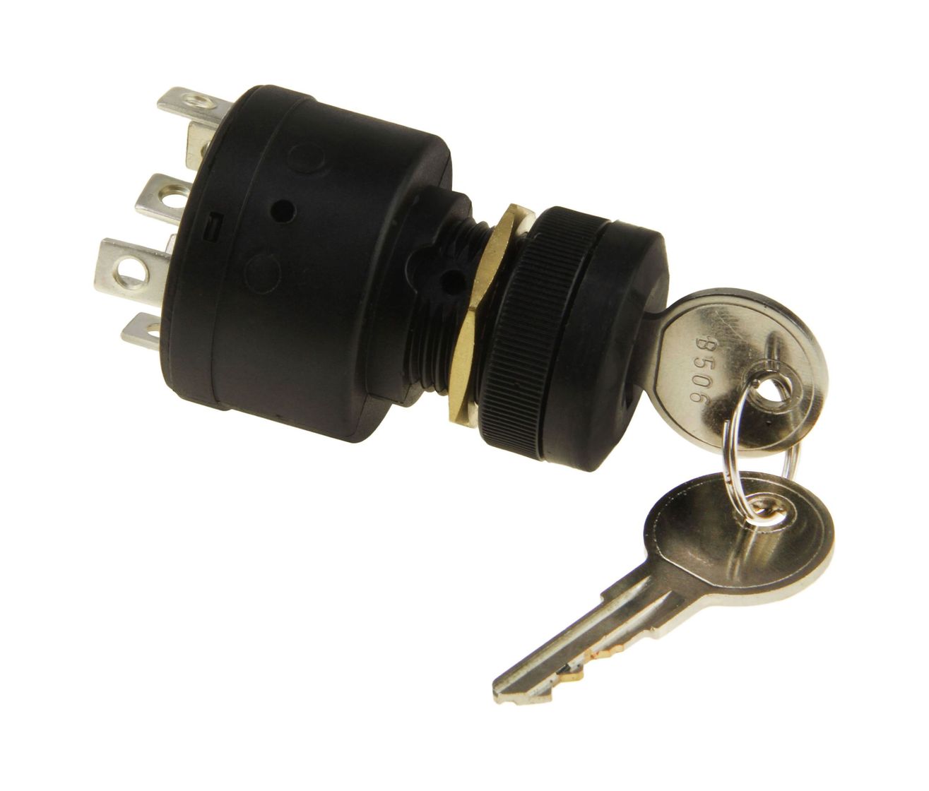 Замок зажигания. Предназначен для подачи питания к системе запуска подвесного мотора или стационарного двигателя. Утапливаемый ключ с режимом электроподсоса. В комплект поставки входит два ключа. Брызгозащищённый.